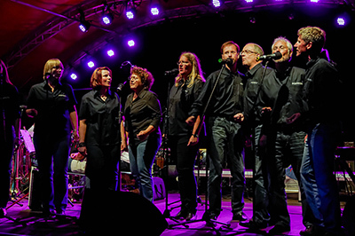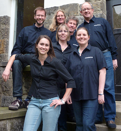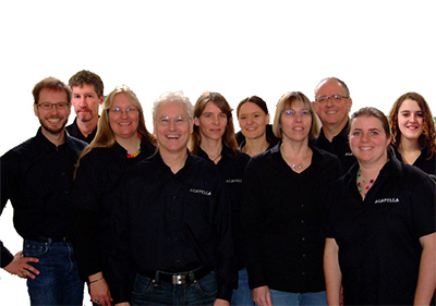 Wir sind eine Gruppe von zehn Sängerinnen und Sängern.